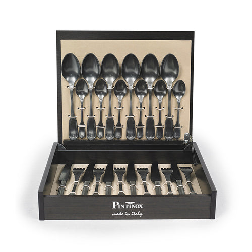 24-piece set of cutlery made of stainless steel with matte gold finish in wooden box. Table fork, table knife, spoon and teaspoon.